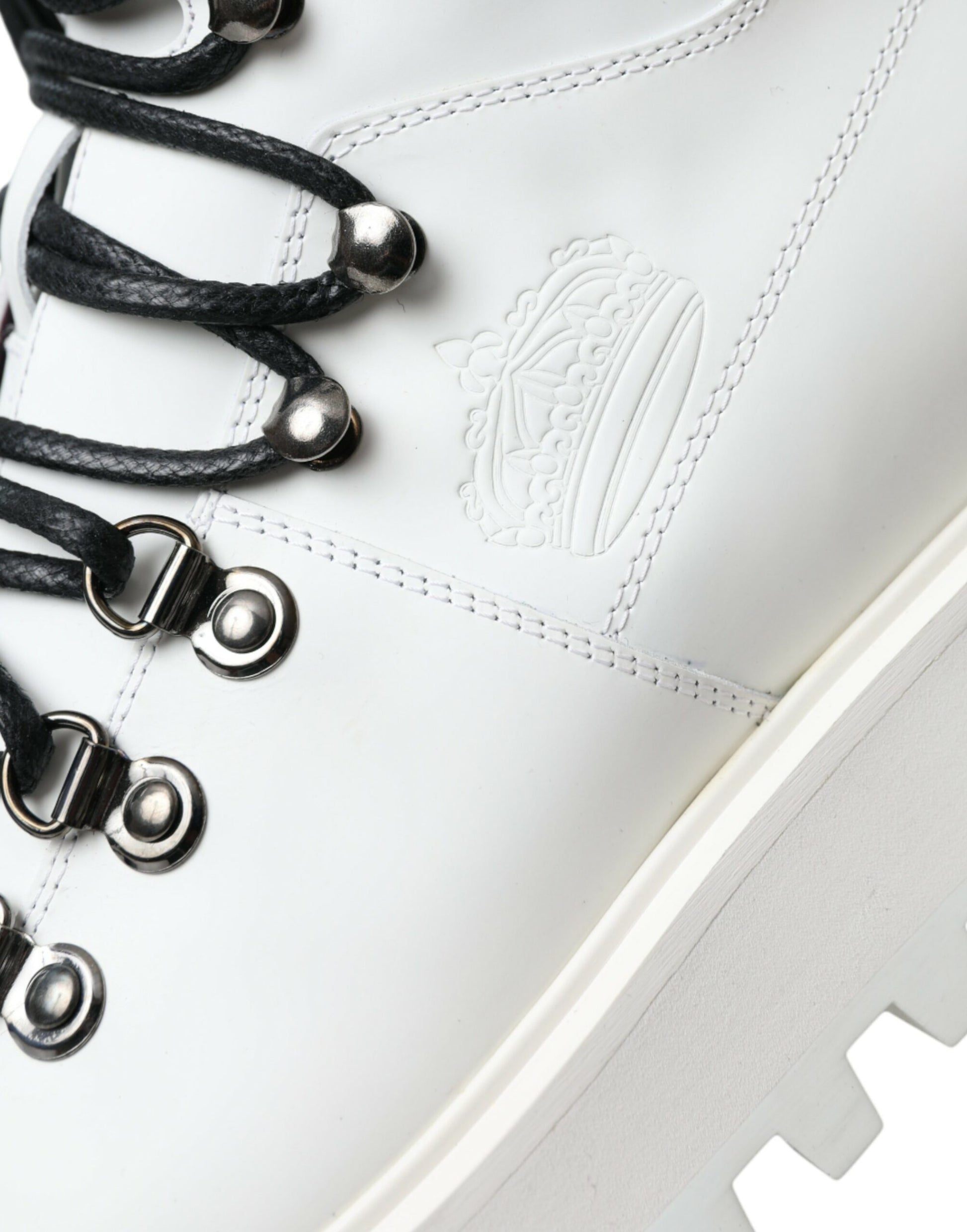 Wunderschöne, brandneue und 100% authentische Dolce & Gabbana weiße Vulcano Trekking-Stiefel aus Leder mit runder Spitze, geriffelter Gummisohle, Schnürverschluss, Knöchellänge sowie seitlichen und hinteren Logo-Details.